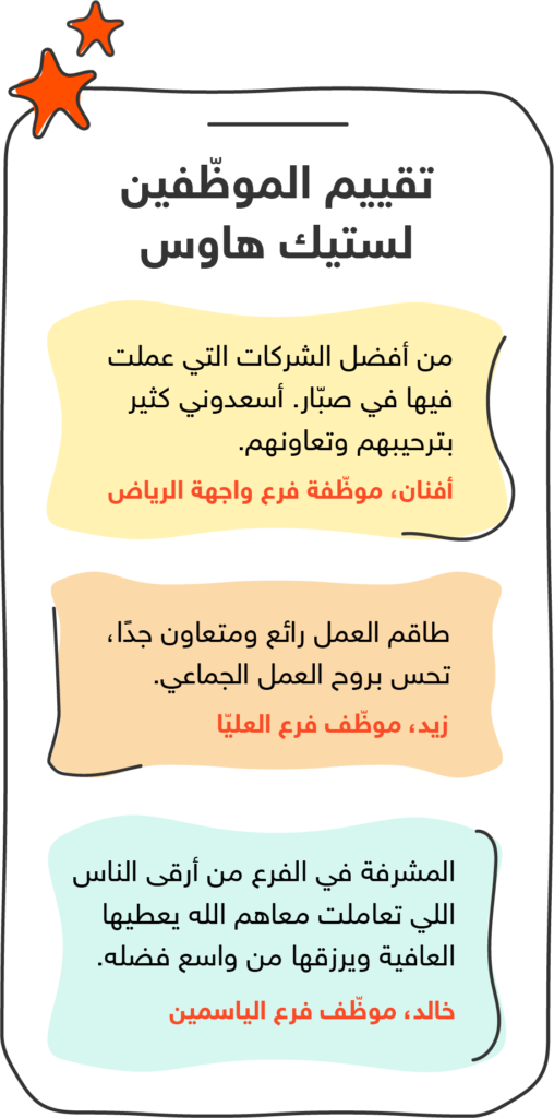 وفّرت صبّار منصّة لتبادل التقييمات للتأكد من وصول صوت الموظّفين إلى الشركة والعكس، وبذلك سهّلت التواصل بينهم ومكّنتهم من التعرّف على أي مشكلة منذ البداية والحفاظ على بيئة عمل متعاونة ومريحة للجميع.