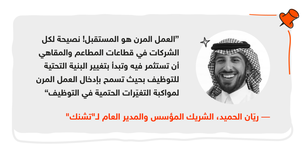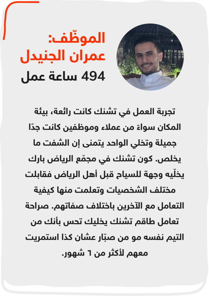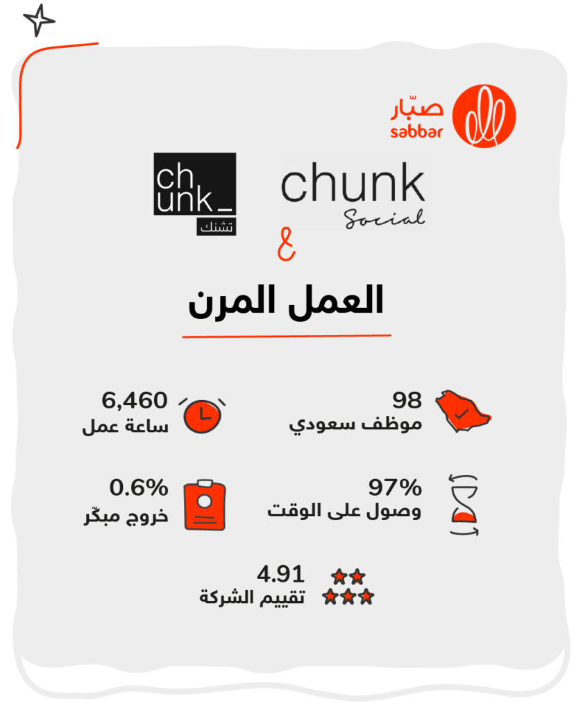 قررت تشنك تجربة العمل المرن عن طريق منصّة صبّار لسهولة التوظيف ومتابعة الموظّفين، وبدأت بطلب موظّف في فرع واحد خلال عطلة نهاية الأسبوع، ثم توسّعت حتى شملت معظم الأدوار الوظيفية في 3 فروع وبشكل يومي.