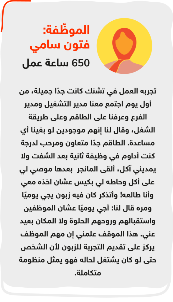 “كنا نروح للفروع إذا طلبنا موظفين من صبّار حتى نتأكد أنهم مناسبين، لكن جودة الموظّفين والموظّفات كل مرة فاقت توقّعاتنا ولاحظنا اهتمام كامل بالعمل لدرجة يوصلون بدري للتجهيز، ويجلسون فترة أطول إذا لاحظوا زيادة في الطلبات، وهذا كله غير مدفوع!”