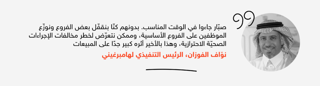 نوّاف الفوزان الرئيس التنفيذي لشركة هامبرغيني لاحظ ازدياد واضح للطلب على المبيعات في آخر سنة 2020 وخصوصًا في بعض الفروع الرئيسية. للمحافظة على الأرباح، سعت هامبرغيني إلى توفير موظفين إضافيين للعمل في وظائف محددة: كاشير و موظّف استقبال و طاقم خدمة في هذه الفروع وفي أقرب وقت ممكن