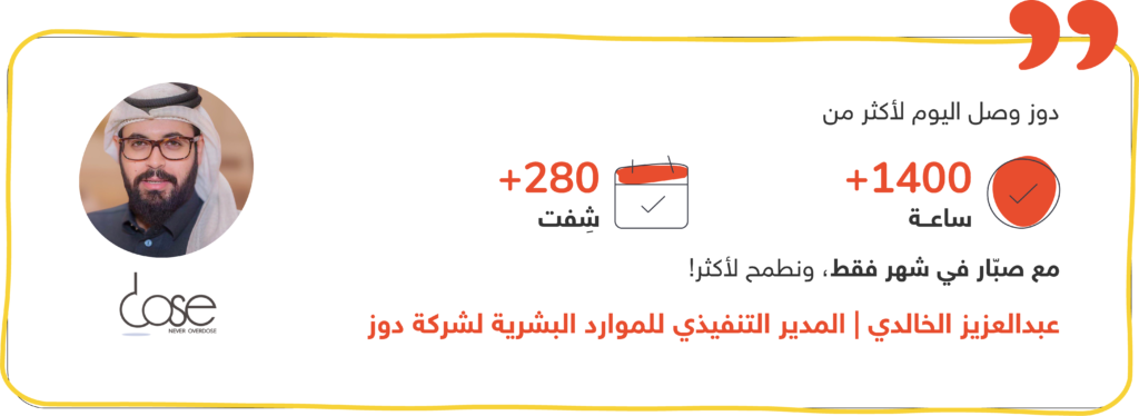 بشكل عام، دوز وصل اليوم لأكثر من ١٤٠٠ ساعة، وأكثر من ٢٨٠ شِفت مع صبّار في شهر فقط، ونطمح لأكثر! اشتغلنا مع صبّار على نقاط نقدر من خلالها نجذب فيه الكفاءات، واحدة منها هي الحفاظ على متوسط ساعات الشِفت الواحد بإنه يكون خمس ساعات.
