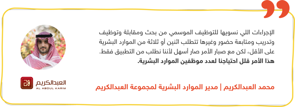 إضافةً إلى ذلك، الإجراءات اللي نسويها للتوظيف الموسمي من بحث ومقابلة وتوظيف وتدريب ومتابعة حضور وغيرها تتطلب اثنين أو ثلاثة من الموارد البشرية على الأقل، لكن مع صبار الأمر صار أسهل لأننا نطلب من التطبيق فقط. هذا الأمر قلل احتياجنا لعدد موظفين الموارد البشرية.