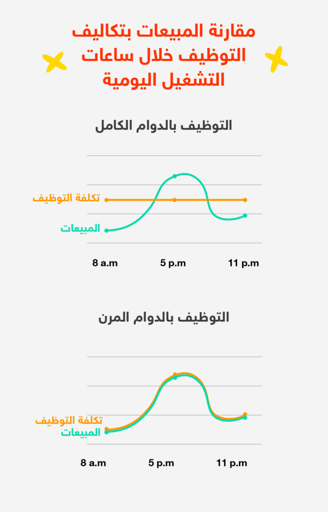 يوضح الرسم البياني ثبات تكلفة التوظيف بدوام كامل رغم تذبذب المبيعات بينما في التوظيف المرن تجد أن .التكلفة ترتفع وتنخفض بما يتماشى مع المبيعات