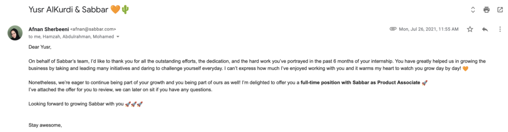 The challenge test presentation went well and I got a positive feedback (I brought 3 cactuses with me so maybe it was the cactus effect on them 🌝 🌵🌵🌵). After the last interview, I was in the car, I opened Sabbar’s website to see a new job opening called “Product Associate Internship” 😱 THIS IS IT!! I want this! Not that!! I reached our to them, and directly told them that I want this position. I opened for them a university project to show them that I know stuff about product and capable for that job!